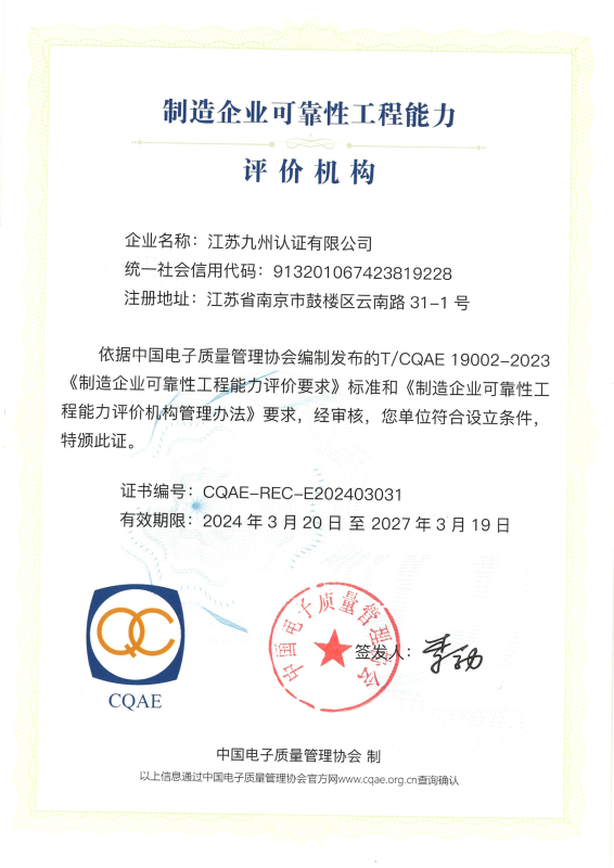 • 制造企業(yè)可靠性工程能力評價機構證書